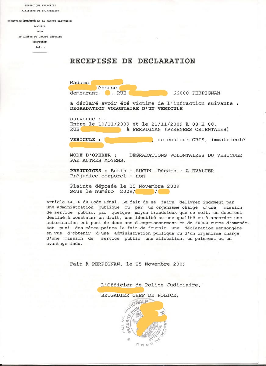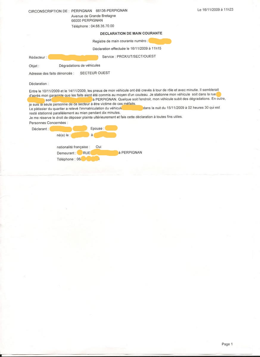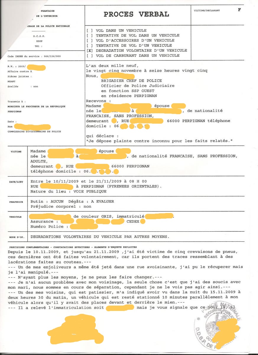 Entre le 10 et le 21 novembre, cinq pneus de la voiture de Madame "Victime" seront crevés de plusieurs coups de couteau chacun, les rendant ainsi irréparables.