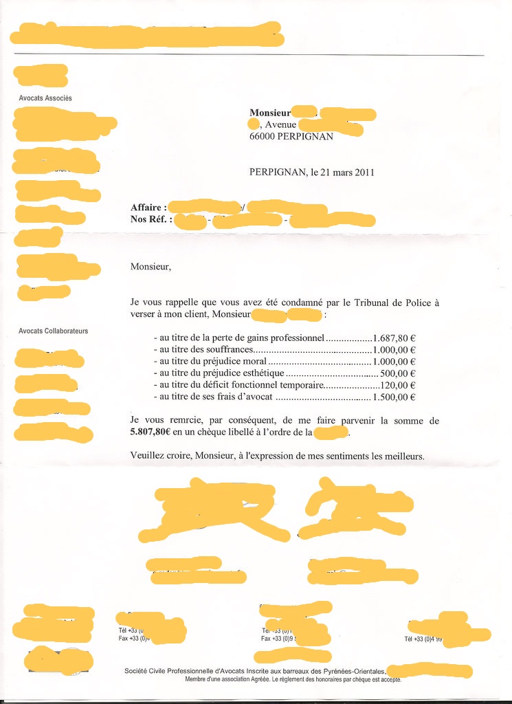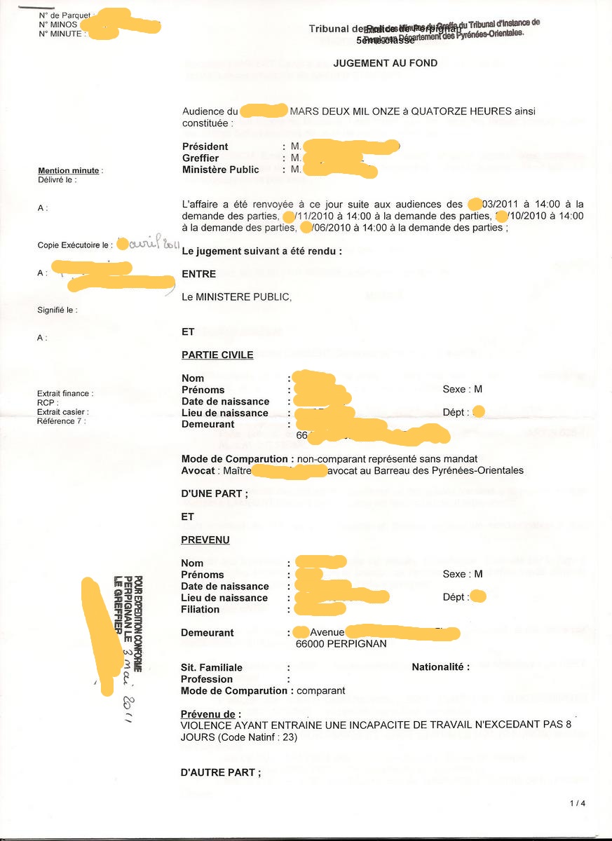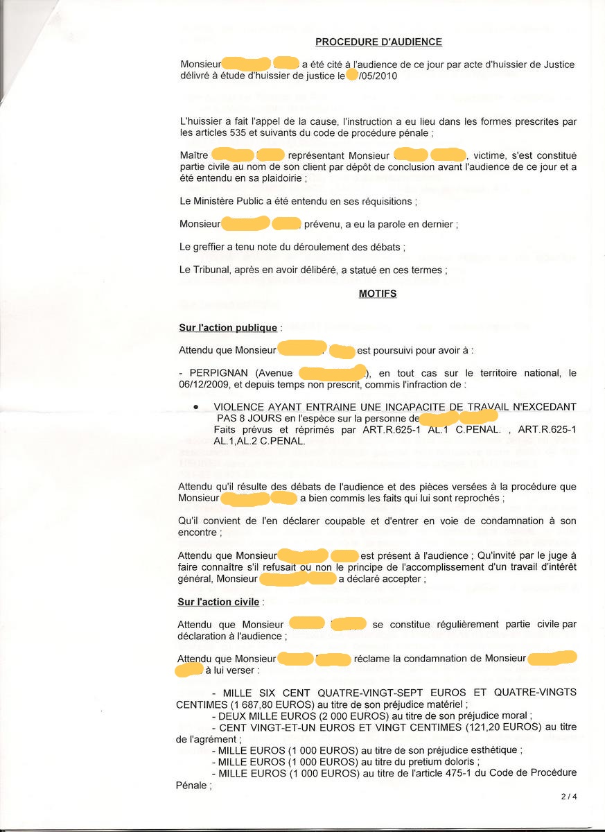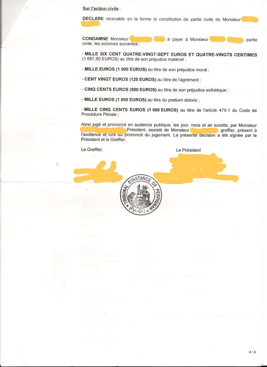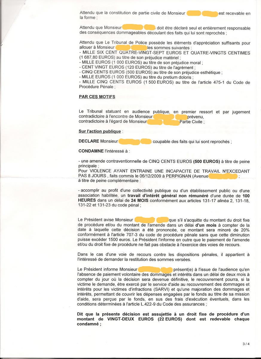 Au jugement, le xx mars 2011, M. "Agresseur" est considéré comme la victime et je suis condamné àverser 5807,80 euros et àcent heures de travail d'intérêt général.