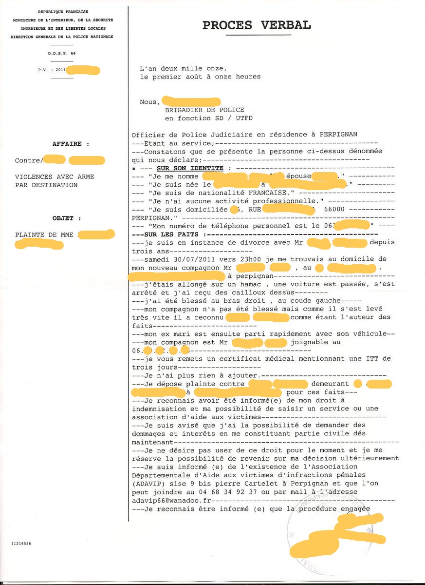 Le 30 juillet au soir, Madame "Victime" se repose dans un hamac, dans le jardin. Il fait nuit. Des cailloux lui sont violemment lancé àpartir de l'allée devant la maison.