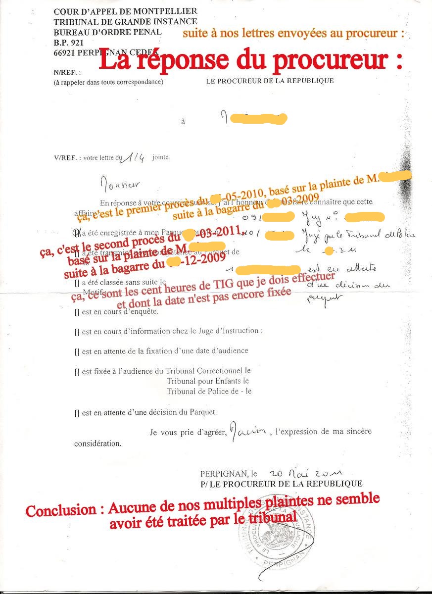 Nous recevons enfin la réponse par un courrier succinct du 11 mai 2011, dans lequel il est mis en évidence que seules les plaintes de M. "Agresseur" ont été traitées par la justice.