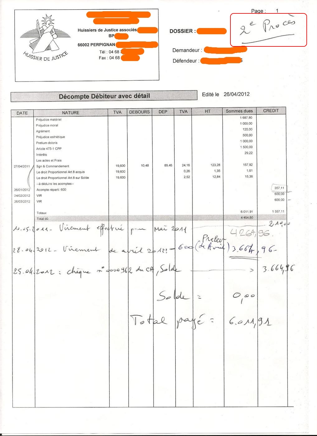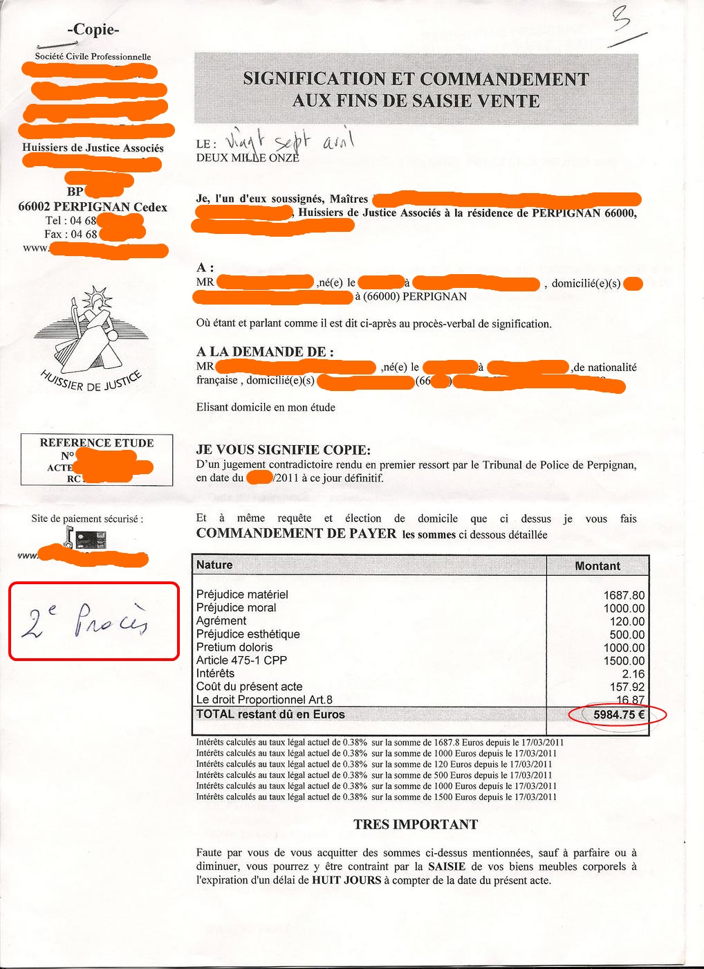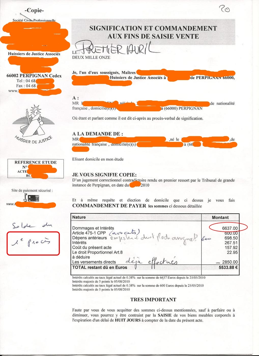 Note : les frais de justice comprennent le remboursement des frais d'avocat de M. Agresseur. (article 475-1 CCP)