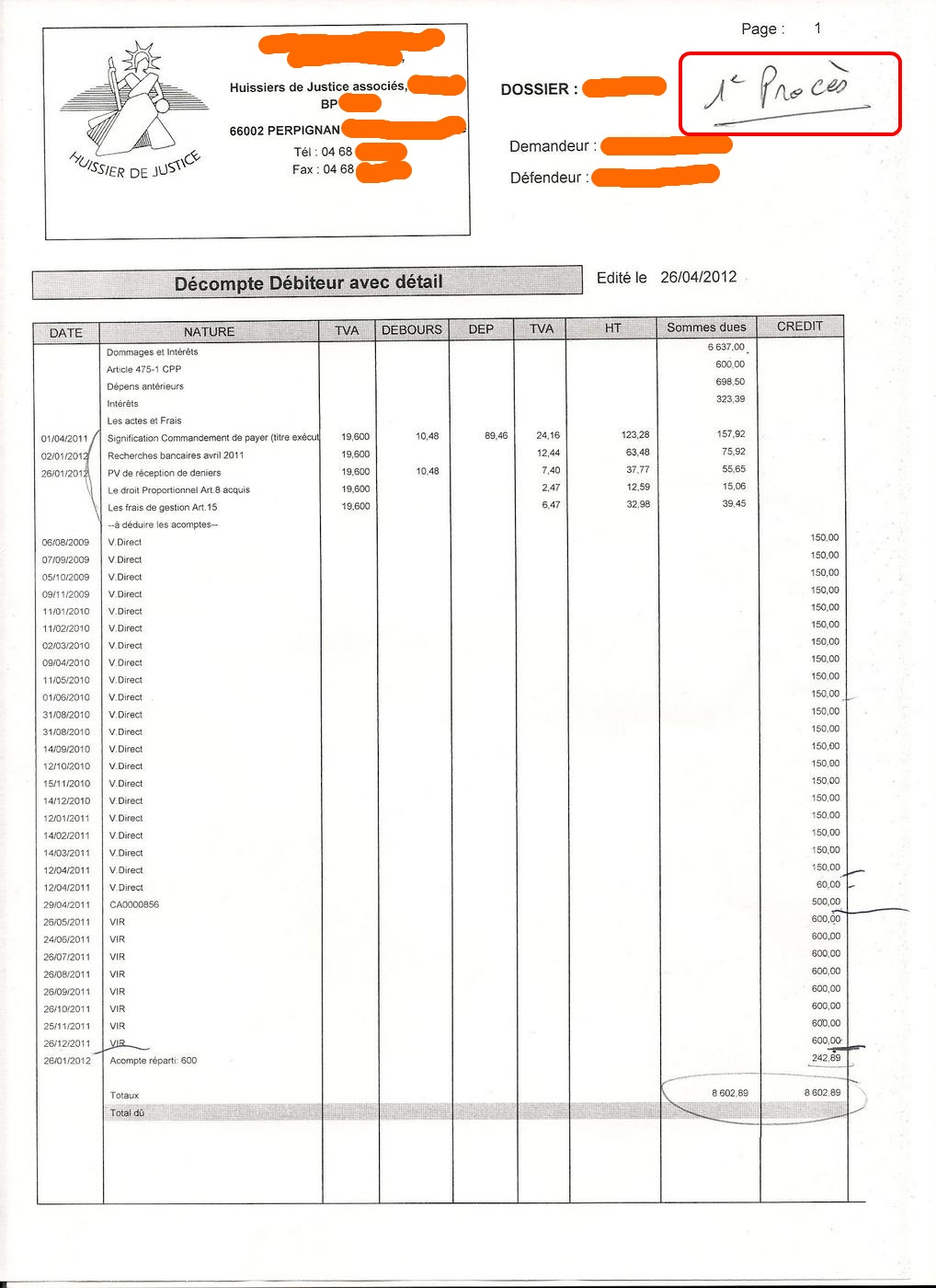 | | M. Agresseur | Frais de justice | Total | | 1 er procès | 6.637,00 | 1.746,88 | 8.383,88 |